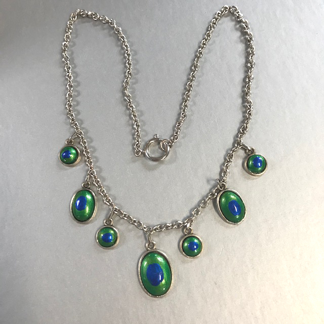 PEACOCK EYE style necklace with 7 eyes on a silver colored metal chain, 18-1/2″. These are not genuine peacock eyes because they are actually green glass cabochons with the blue eyes hand painted onto them. View View #Y41176 $58.00