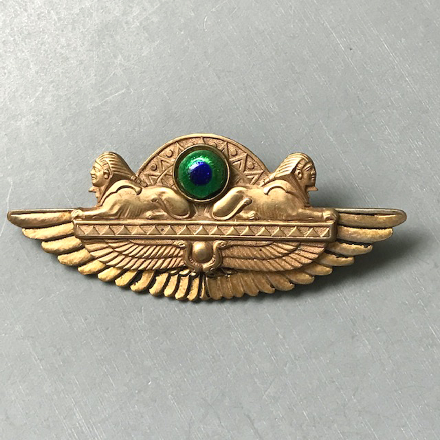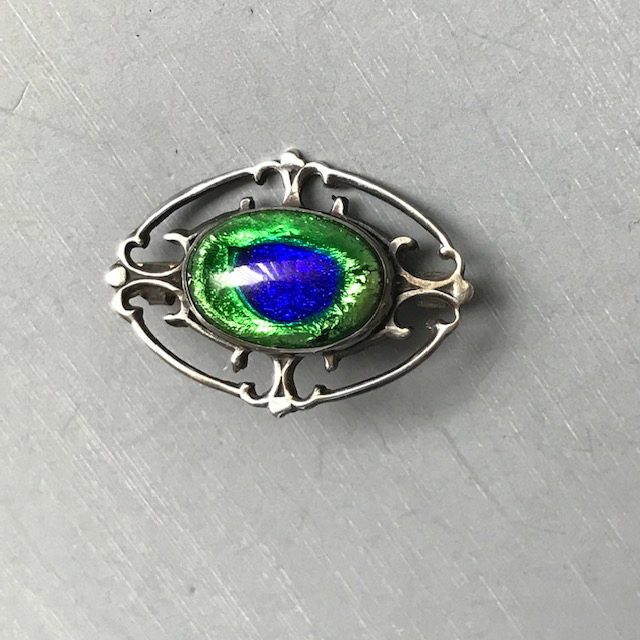 PEACOCK EYE antique pin with an oval eye set in silver metal with back to back “C’s” designs on four sides. It is small at 1-3/16″ by 5/8″ and fun to wear for a touch of color. The eye is foiled blue and green glass, probably from Gabonz, Czechslovakia, and brooch made in about 1900-1910. … Continue reading “PEACOCK EYE antique pin with an oval eye set in silver metal with back to back “C’s” designs on four sides”