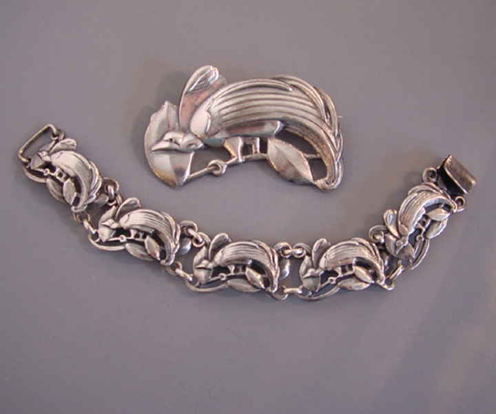 McCLELLAND BARCLAY Arts & Crafts sterling figural bird bracelet and brooch set, bracelet 6-7/8″ by 3/4″ and brooch 2-1/2″. The bracelet weighs 1 ounce and the brooch is 0.7 ounces. McCLELLAND BARCLAY was both an illustrator and a designer. Born in 1891, he painted and made sculptural utilitarian pieces and decorative objects for the home, … Continue reading “McCLELLAND BARCLAY Arts and Crafts sterling silver bird bracelet and brooch”