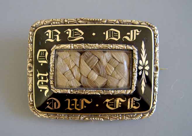 VICTORIAN antique early pre Civil War 1840s hair brooch in 14 karat yellow gold with black enamel and three strands of plaited thick blonde hair under glass, 2″ by 1-1/2″. It has the tube and c-catch closure with an extended pin stem typical of this era. The mourning message “In Memory Of” in old English … Continue reading “VICTORIAN antique pre-Civil War dated 1843 14 karat yellow gold and hair brooch”