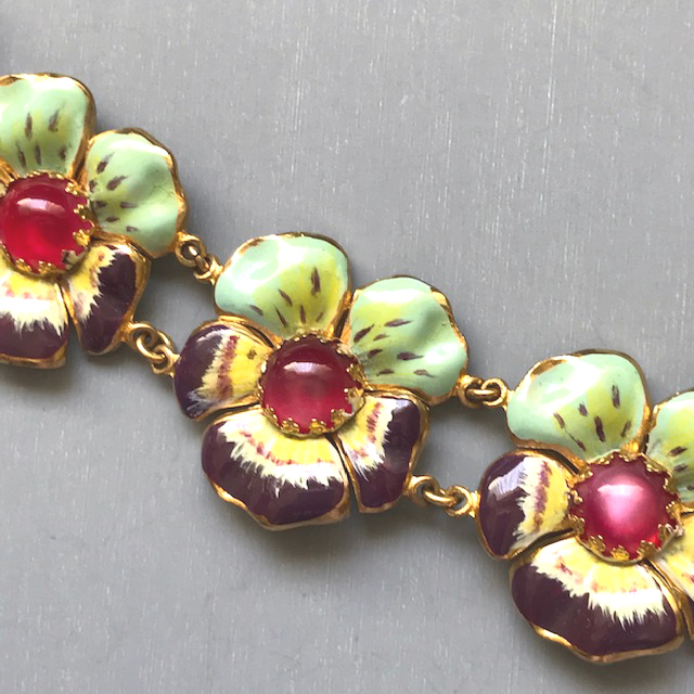PANSY rare enameled pansy flowers bracelet with rose colored glass cabochon centers and purple, green and yellow enameled flowers on gold plated metal. This bracelet has really wonderful detail so be sure to look at the close-up photos. It is 7″ by 1″ and in excellent condition, amazing for it’s age. I think it was … Continue reading “PANSY rare enameled pansy flowers bracelet with rose colored glass cabochon centers and purple, green and yellow enameled flowers”