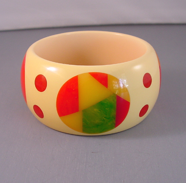 SHULTZ bakelite red bangle with 10 cream color bowtie dots, 2-1/2″ by 1/2″ by 1/3″. I purchased this directly from Shultz in 2009 and it has been in my personal collection since then. View View #B35366 $258.00