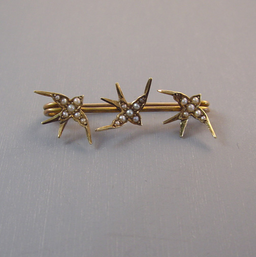 EDWARDIAN dainty 10 karat yellow gold and seed pearl birds in flight bar pin circa 1900, 1-1/3″, no marks but tests 10k. This is a fine jewelry piece and it is in excellent condition. View #Q12787 $130.00