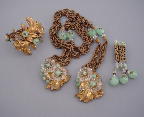 MIRIAM HASKELL by Frank Hess lariat necklace, coil bracelet and fur clip of gorgeous clear glass flowers and green glass beads on gold tone leaves and chains. The chain portion is 23″ long and each dress clip is 2-1/8″ wide. The necklace wraps around your neck and each clip fastens to your neckline or collar. The … Continue reading “MIRIAM HASKELL Frank Hess lariat, bracelet & fur clip”