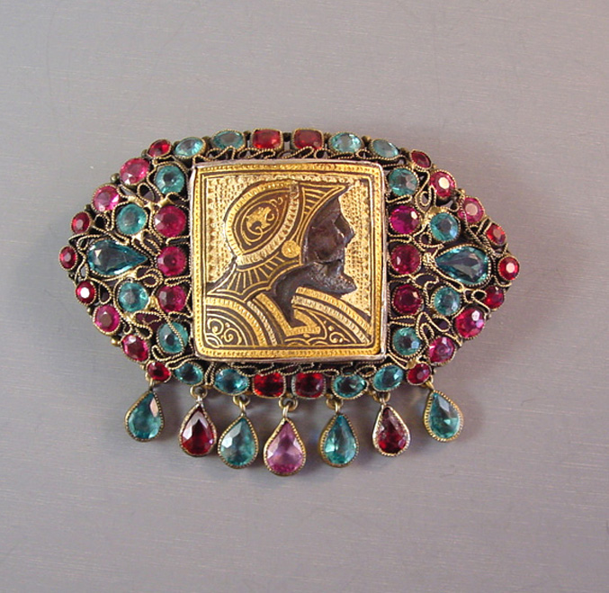 HOBE Damascene centered warrior brooch, what a beauty! It has unfoiled red, rose, aqua rhinestones and teardrop-shaped rhinestone dangles that all set in hand wrought wire work. It is marked on the back “Hobe” and it’s 3″ by 2-1/4″. This is circa 1940 and in excellent condition, my personal favorite era for Hobe jewelry. View #O37991 $498.00