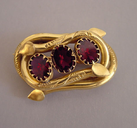 VICTORIAN love knot brooch with lovely design and garnet-colored glass rhinestones in dog tooth settings, circa 1900, 1-3/4″. The knot was a Victorian symbol of unbreakable love. View #Q10047 $238.00