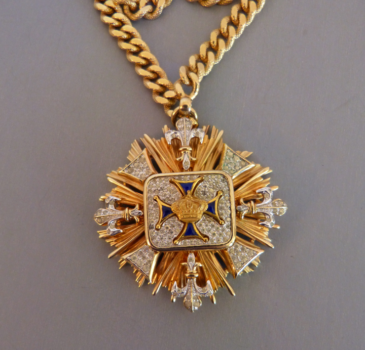 NETTIE ROSENSTEIN regal Maltese cross pendant with blue enamel, a gold tone cross symbol, and clear rhinestones in a gold plated setting with clear rhinestones accented with fleur-de-lis, circa 1965. The wide chain is 22″ long and the pendant 2-1/3″. Signed on the back “Nettie Rosenstein” it is in excellent sparkling condition. This is the … Continue reading “NETTIE ROSENSTEIN regal Maltese cross pendant with blue enamel and clear rhinestones”