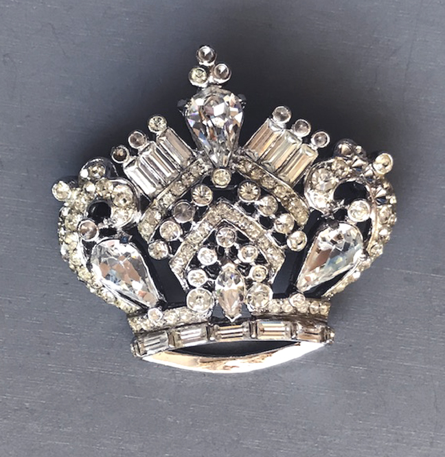 JOSEFF by JOAN CASTLE regal matte gold tone crown pin with clear rhinestone atop, 2-1/2″. This was made for the old TV show “Queen for a Day” which aired in the 1950s. A brooch like this can be seen in the Joanne Dubbs Ball’s book “Jewelry of the Stars, Creations from Joseff of Hollywood” on … Continue reading “JOSEFF by JOAN CASTLE regal matte gold tone crown pin, 1950s Queen for a Day”