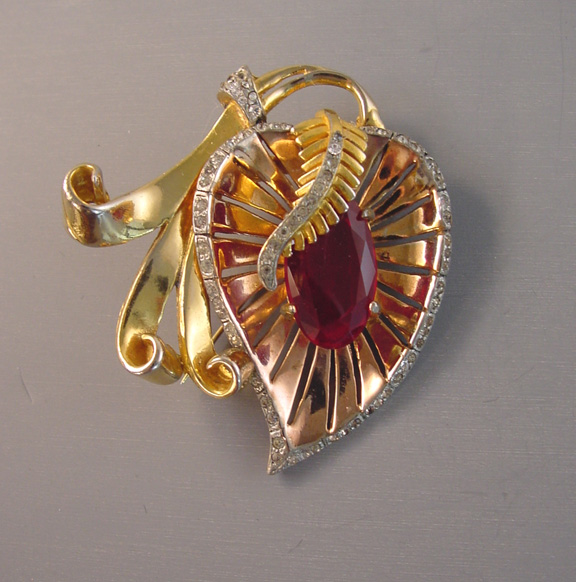 RETRO unsigned stylized leaf brooch with red rhinestone center, clear rhinestone accents set in yellow and rose gold colored metal, the bows and pierced leaf add dimension and this is beautifully made, circa 1940, 2-5/8″ by 2-1/3″. I have seen these marked Reinad and De Rosa, but this has no mark at all. It is … Continue reading “RETRO stylized leaf brooch with red rhinestone center”