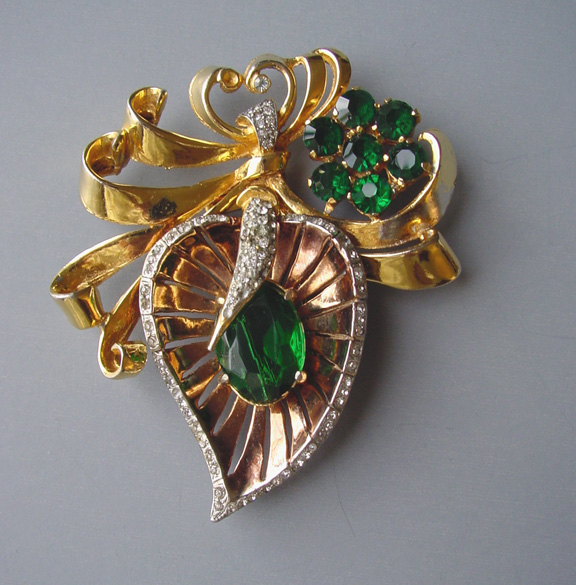 RETRO stylized leaf fur clip with green and clear rhinestones set in gold tone, the bows and pierced leaf add dimension, 3-1/2″ by 3″. I have seen these marked Reinad and De Rosa, but this has no mark at all. It is in excellent condition in all ways except for some very light graying of some of … Continue reading “RETRO stylized leaf fur clip with green and clear rhinestones”