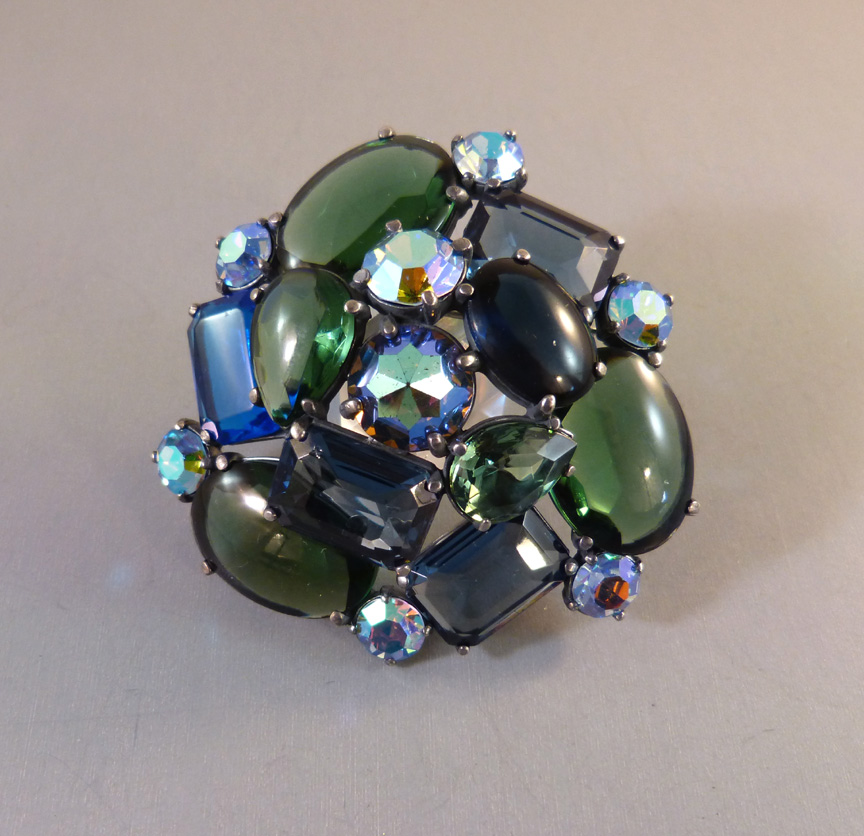 SCHIAPARELLI brooch with brown and gray unfoiled cabochon rhinestones and faceted aurora borealis, circa 1960 and a nice size at 2-5/8″. It is not signed, but the Schiaparelli in this style were signed on the earring clip backs rather than on the brooches, and we have the signed earrings, too. The bracelet that matches this … Continue reading “SCHIAPARELLI brooch with brown and gray unfoiled cabochon rhinestones and faceted aurora borealis”