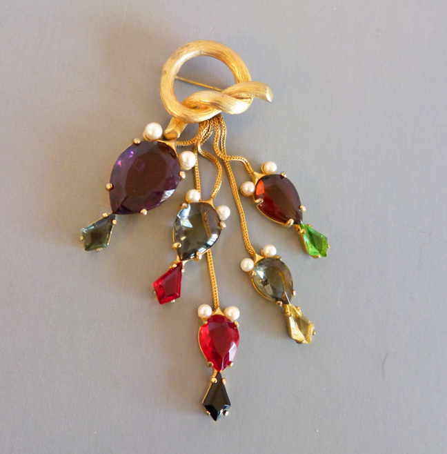 SCHIAPARELLI brooch with rich gem colored rhinestones in a brushed gold tone knot setting, circa 1960. It is 4-1/3″ long by 1-1/3″ wide and in excellent condition. This set was signed on the bracelet, which I have seen and have a photo of, but not on the brooch. It’s a lovely cascade of color! View … Continue reading “SCHIAPARELLI brooch with a cascade of rich gem colored rhinestones”