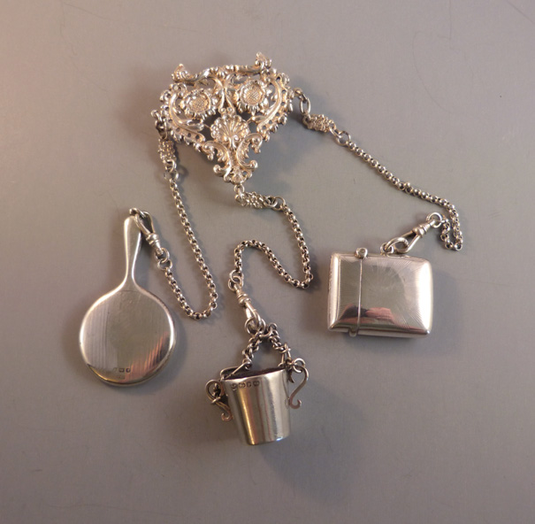 ENGLISH Victorian sterling chatelaine with mirror, thimble bucket and stamp box, hallmarked 1892 to 1914. All pieces are marked as Birmingham, England, sterling. The chatelaine is hallmarked for the maker “L E” and 1892, and has designs of sunflowers and a seashell with scrolls, 2-1/4″ by 2-1/4″ with chains 5″ to 6-1/2″. The stamp box is … Continue reading “ENGLISH Victorian sterling chatelaine mirror, thimble bucket etc”