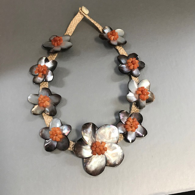 MIRIAM HASKELL necklace from France, abalone sea shells on woven cord necklace with tiny orange seashell accents, 19-1/2″ wearable length and the shells range from 2-1/2″ down to 1-5/8″. I have had other necklaces similar in style to this and some were marked “France”. I assume Haskell got them from there, just as she sourced … Continue reading “MIRIAM HASKELL necklace from France, abalone sea shells on woven cord”