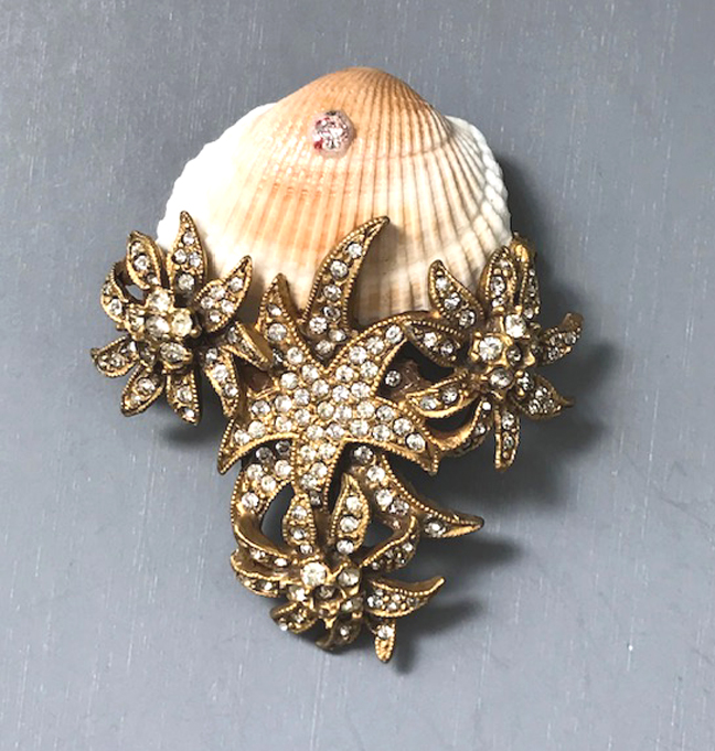 DENICOLA genuine seashell brooch with clear rhinestones set in gold tone, 2-1/3″. This brooch is a real treasure from the sea, made in about 1960. View View View #X41848 $88.00