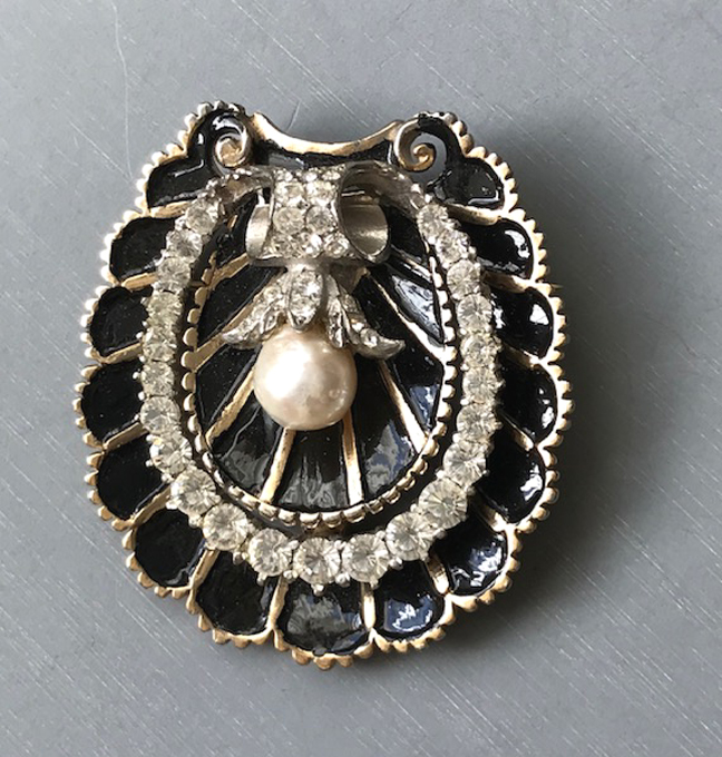 DEROSA seashell shaped black enameled fur clip with a glass pearl and clear rhinestones in a gold plated sterling silver setting. This is signed on the back in tiny letters “R Derosa”, it was made in about 1947, and is 2″ by 1-3/4″. Pieces from this group are in the amazing Brunialti book “American Costume … Continue reading “DEROSA seashell shaped black enameled fur clip with a glass pearl and clear rhinestones in a gold plated sterling silver setting.”