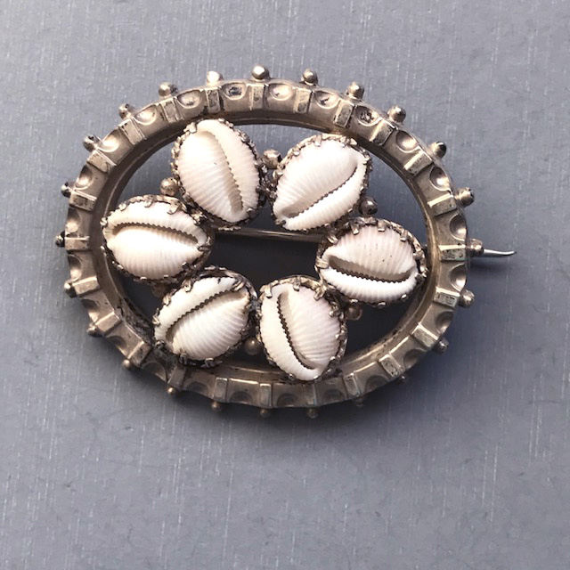 VICTORIAN antique silver brooch with tiny prong-set genuine seashells surrounded by a lovely and detailed dental and beaded edge, 1-3/4″. Made in the 1880s, this could have been a souvenir of a visit to the seaside. The seashells are so dainty and in wonderful condition. View #V31800 $168.00