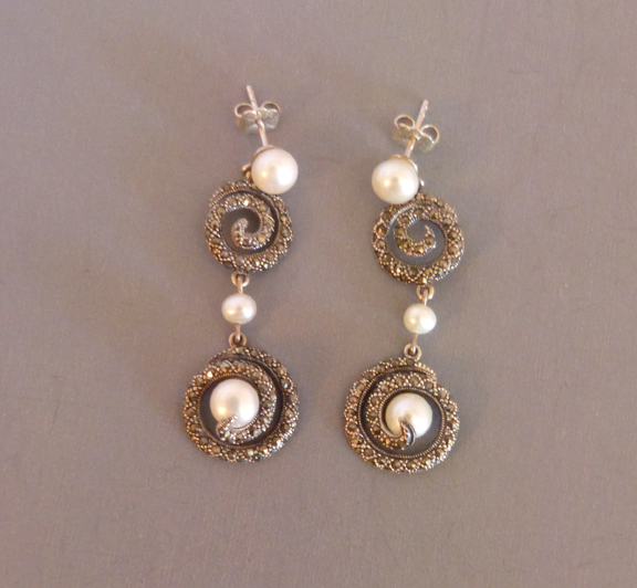 JUDITH JACK snake earrings with marcasites, sterling and pearls. For pierced ears, they are a total length of 1-7/8″ top to bottom. These are circa 2000 and in excellent condition, really fun coiling serpent creatures. View #X36060 $98.00