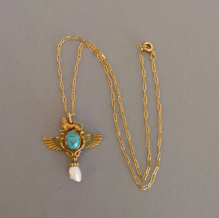 EGYPTIAN DECO motif pendant in 14 karat yellow gold with a turquoise scarab center and enameled outstretched wings. There is a Sphinx and serpent on the sides and lion top, with a dangling fresh water pearl, all set in a matte finish gold, circa 1920’s Deco. It is 1-1/8″ by 1″ not counting the top loop and … Continue reading “EGYPTIAN 14k DECO motif pendant scarab”