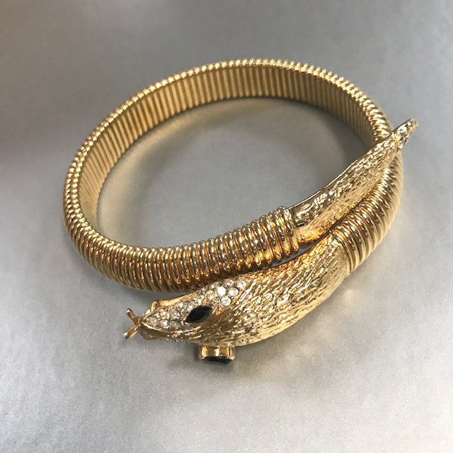 SNAKE coil bracelet in gold tone metal with clear rhinestone muzzle and black rhinestone eyes, a great figural creature to have in your jewelry wardrobe. It fits an 8″ wrist but it’s longer than that due to the cross-over in front. This serpent is in excellent condition right down to it’s forked tongue! View #Y41399 … Continue reading “SNAKE coil bracelet in gold tone metal with clear rhinestone muzzle and black rhinestone eyes, a great figural”