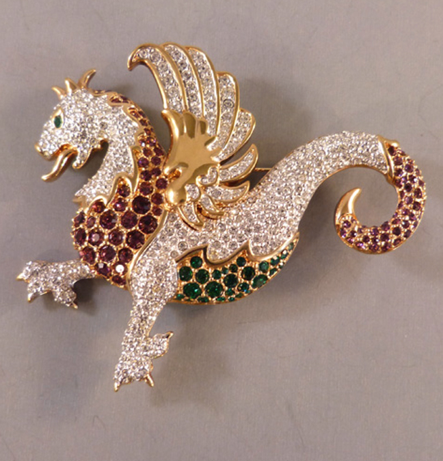 SWAROVSKI brooch of a winged figure hippocampus creature figural with clear rhinestone pave wings and body and a green eye set in a hand polished gold plated setting, 3-1/4″ by 2-1/2″. After years of thinking this was a griffon, a dragon or serpent, I ran across a web page that showed it as a “hippocampus”, … Continue reading “SWAROVSKI brooch of a winged figural hippocampus creature figure with clear rhinestone pave wings and body”