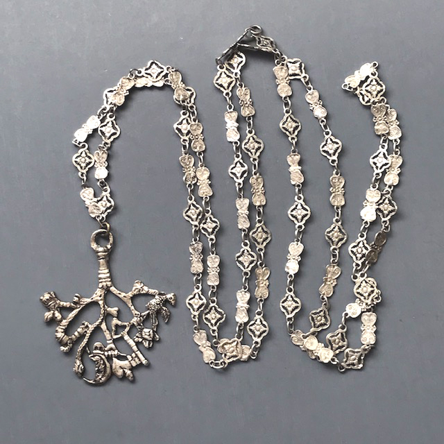 ITALIAN CIMATURA or good luck charm necklace, worn to ward off evil. It is a cast 800 sterling silver pendant and chain necklace, the pendant with interesting little figures all over it. The herb rue is the base of this design and it also includes a moon, serpent key, hand, and heart. There is also … Continue reading “ITALIAN CIMATURA or good luck charm necklace, rue, figures and meanings”