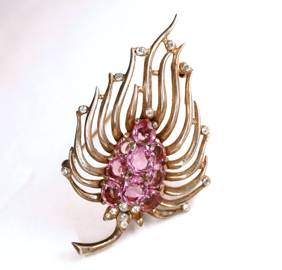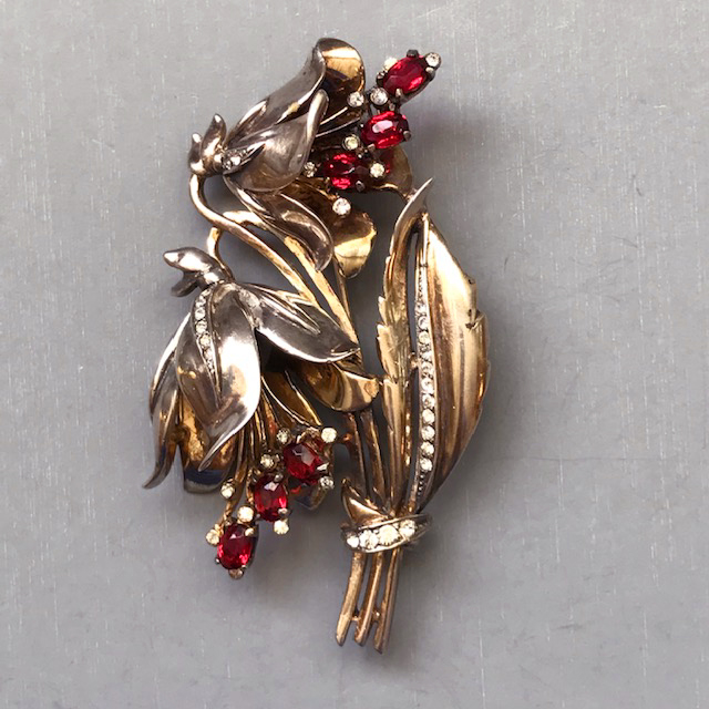 DEROSA Retro ribbon and bow fur clip with emerald green and clear rhinestones in a gold plated setting from the later 1940s, signed “R DeRosa” it is 2″ by 1-3/4″. The green color of the rhinestones is rich and lovely against the golden setting. View View View #d42305 $598.00