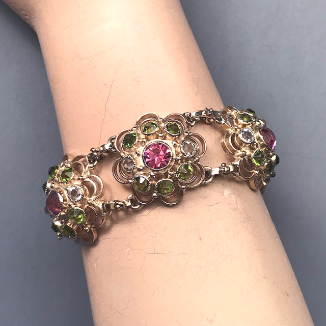 HOBE signed bracelet with bight sparkling pastel blue, aqua and clear rhinestones set in hand made sterling silver wire filigree masterfully created. It still has it’s safety chain, wearable length is 7″ long and it is 1″ wide. Very brilliant, in excellent vintage condition with one VERY minor flea bite on a clear rhinestone, only … Continue reading “HOBE signed bracelet with bight sparkling pastel blue, aqua and clear rhinestones set in hand made sterling silver”