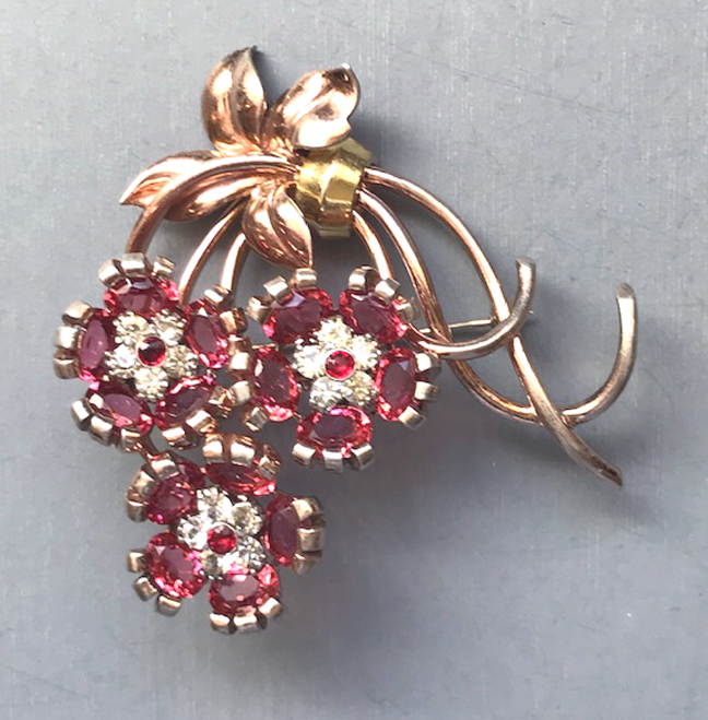 ORIGINAL by ROBERT radiant and unusual brooch with a lovely combination of red, rose, purple and blue cabochons with dragon’s breath cabochons, 2″ in each direction and made in the 1960s. I appreciate the way the stones are in different styles of settings which adds so much interest to the design, and also the wonderful … Continue reading “ORIGINAL by ROBERT radiant and unusual brooch with a lovely combination of red, rose, purple and blue cabochons with dragon’s breath cabochons, limb setting”