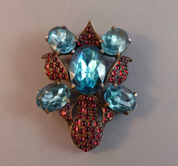 HOBE sterling figural brooch with tinted Asian lady in flowing robes figure surrounded by blue, purple and pink unfoiled rhinestones set in hand worked sterling leaves, berries and scrolls, unsigned but guaranteed Hobe circa 1940, 3-5/8″ by 2-1/4″. A similar piece dated 1944 can be seen on our Hobe patents page by clicking on our Jewel … Continue reading “HOBE sterling figural brooch with tinted Asian lady”