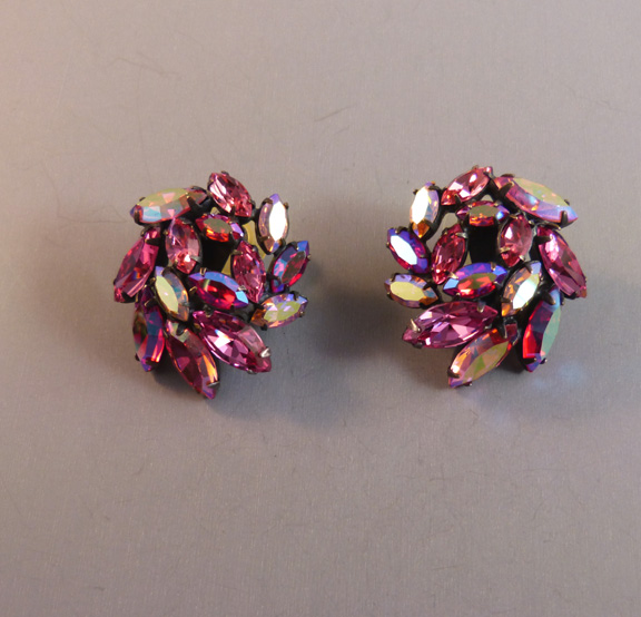 JULIANA D&E (Delizza and Elster) unfoiled baby blue rhinestone heart earrings with aurora borealis accents set in gold tone. Look carefully and you will see that the center rhinestones are an upside-down hearts and the three enclosing them are elongated marquis, all circa 1960 and in excellent condition. The clip back earrings are unsigned and 1-1/3″. … Continue reading “JULIANA D&E unfoiled baby blue rhinestone heart earrings”