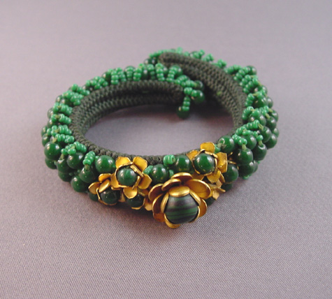 NECKLACE white glass seed beads multi-strands necklace with a lovely two piece pale green glass cabochons and yellow rhinestones catch set in gold tone, wearable length 23″. This is so beautiful and in excellent vintage condition. View View #Y37841 $98.00