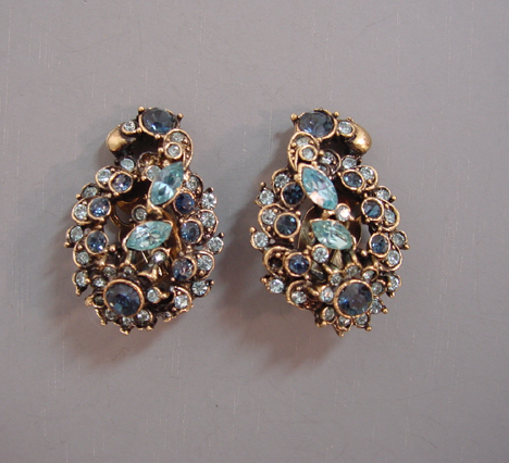 EISENBERG unsigned dress clip in pink, blue and clear rhinestones with a “Jello mold” blue glass center. It is all set in silver tone metal. It is 2-3/4″ by 2-1/4″ in size and circa 1940. With the combination of stones and colors, it’s so unusual and really lovely. View View #E37828 $288.00