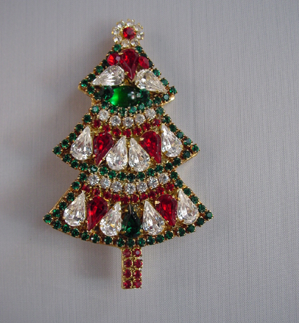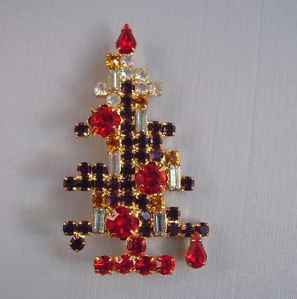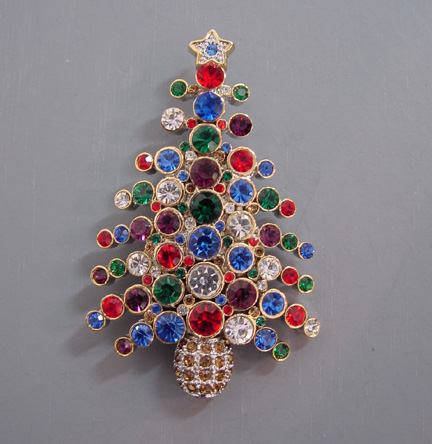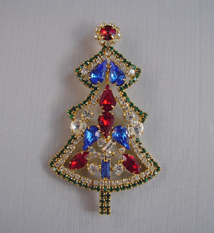 CHRISTMAS tree brooch with red, blue, green, pink and clear marquis rhinestones set in gold tone, 2-1/4″. #Y65728 $28.00