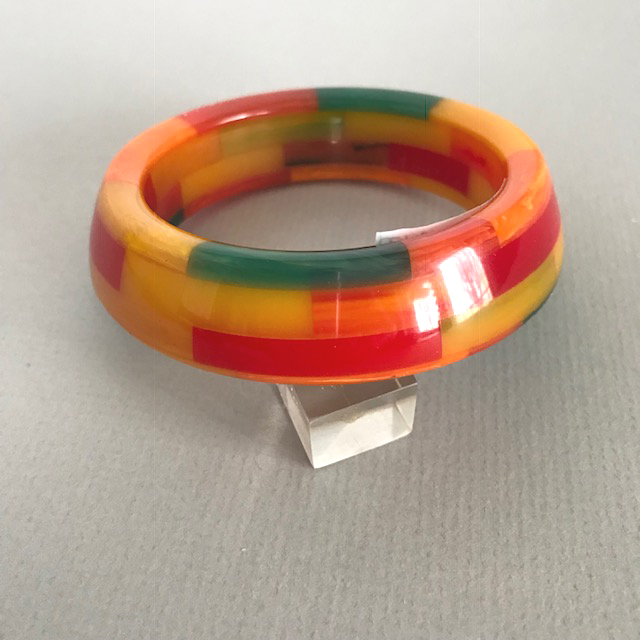 SHULTZ bakelite bangle with cheerful multi-colored oval dots on a transparent bangle, which will turn back to a transparent green over time, 2-1/2″ by 5/8″ by 1/3″. The design of each oval dot are is different and all of them are creatively used. Artisan Ron Schultz, who began making his wonderful bakelite jewelry in the … Continue reading “SHULTZ bakelite bangle with cheerful multi-colored oval dots”
