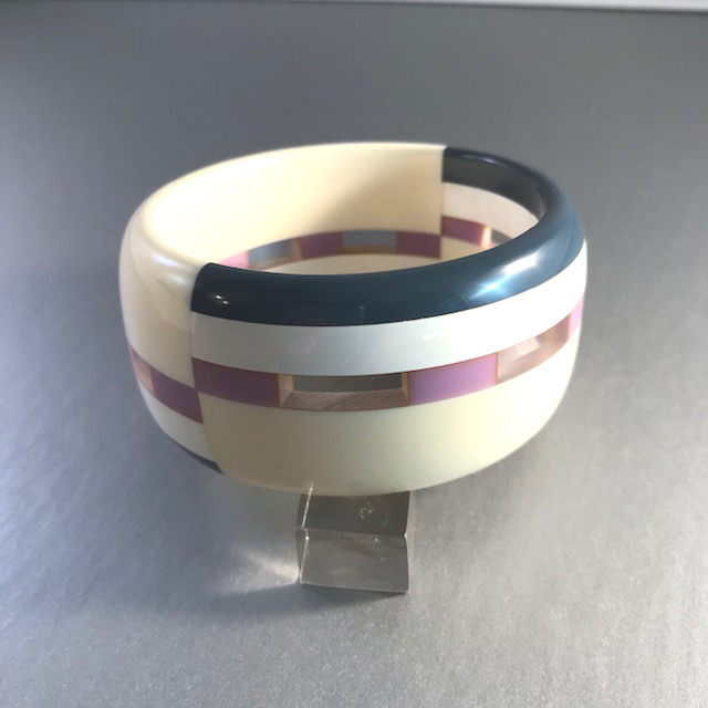 WELCH/SHULTZ bakelite bangle created from parts from a broken bangle and refashioned into a new bangle and signed both for Brandon Welch, who recreated it, and “S” for Shultz, who originally made it. The bangle is 2-1/2″ by 1-1/3″ with 1/3″ walls. It has a contemporary sleek look in cream, lavender and slate gray, really … Continue reading “WELCH/SHULTZ bakelite bangle in cream, lavender and slate gray, really unusual”