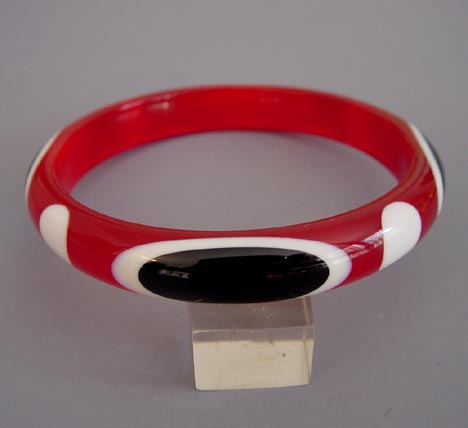 SHULTZ bakelite bangle in cherry red transparent with black and white double Belle Kogan oval dots. View #B31598 $258.00