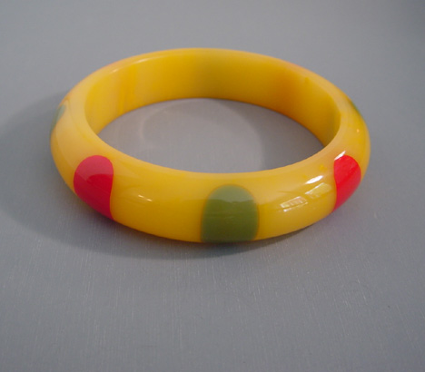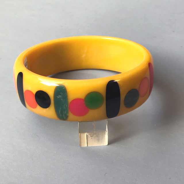 SHULTZ bakelite yellow bangle with oval bull’s eye dots in red, white, orange, green yellow and pink, 2-1/2″ by 3/4″ by 1/2″. The Shultzs’ started making bakelite jewelry in the 1980s and they make some pieces still. Ron Schultz creates his wonderful jewelry using vintage 1940s bakelite materials, and this was made in 2013. It … Continue reading “SHULTZ bakelite yellow bangle with oval bull’s eye dots in red, white, orange, green yellow and pink”