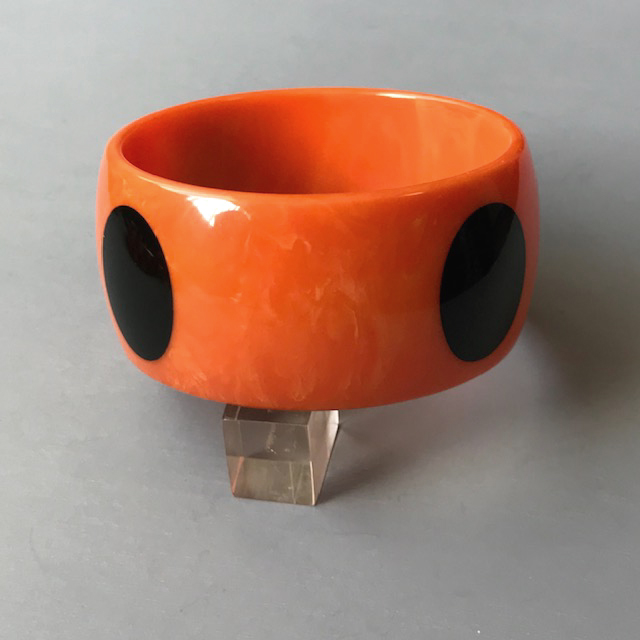 SHULTZ bakelite sunny lemon yellow bangle with 8 black oval dots all the way around it. It is 2-1/2″ by 1″ by 1/3″. Ron Shultz creates his colorful bangles from 1940-era bakelite stock, and he has been doing that since the 1980s. #B64480 $368.00