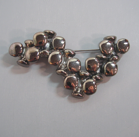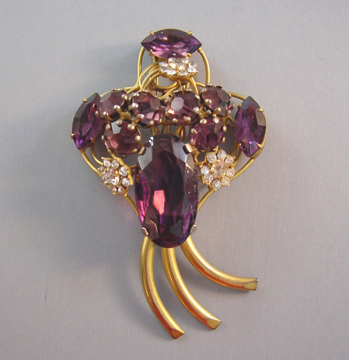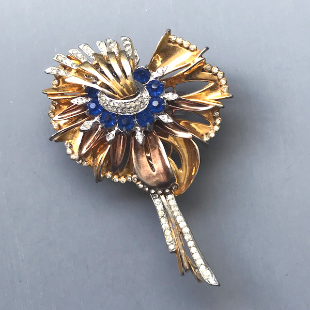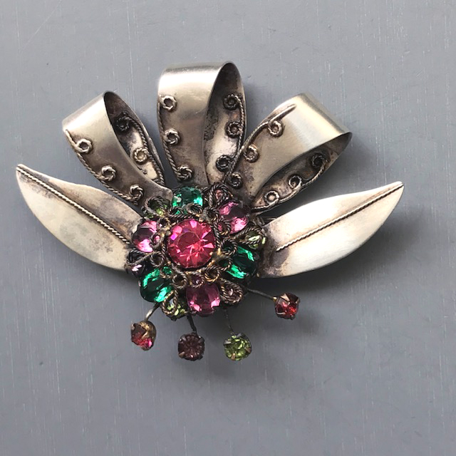 ORIGINAL by ROBERT sterling silver brooch with rhinestones in pink, green yellow green and purple, signed on the palette on the back “Original by Robert” wit the word “sterling” beneath it. It was made in the 1940s and is 2-1/2″ by 2″. The bows and leaves are decorated with simple applied wire work, and there … Continue reading “ORIGINAL by ROBERT sterling silver brooch with rhinestones in pink, green yellow green and purple, signed”