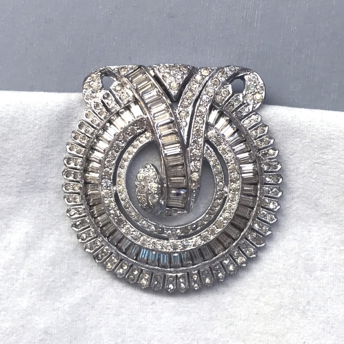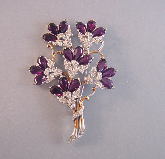 RUTH KAMKE designed very rare flower fur clip with three dazzling clear pave rhinestone flowers that each have red collet set rhinestone stamen, set so they move back and forth, and with green pearlized enameled leaves. It is a nice large size at 4-1/4″ by 4-1/4″. When I say “rare”, I have been told that Ruth … Continue reading “RUTH KAMKE designed very rare flower fur clip along with the design drawing”
