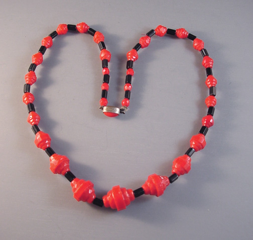 VOGUE red lava look poured and fused glass earrings set in gold tone, clip back 1-1/8″. Vogue made jewelry from about 1935-75 in New York City. I don’t often see these and they are among my favorite Vogue styles, reflecting light beautifully. View #X37436 $78.00