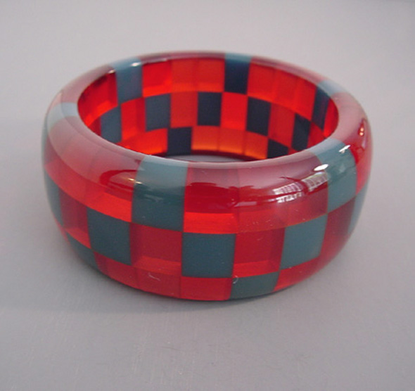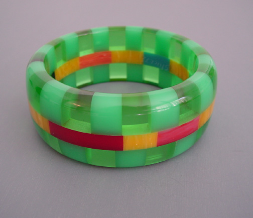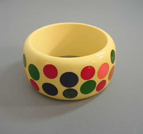 SHULTZ bakelite pink swirl bangles with blue dots, set of 2, each 2-1/2″ by 1/3″. This is a really rare color, and to have the set is very unusual. Ron Schultz creates his wonderful jewelry using only vintage circa 1940 bakelite, and every piece is his own original work. It is signed, as are almost all Shultz pieces, and in … Continue reading “SHULTZ bakelite pink swirl bangles with blue dots”