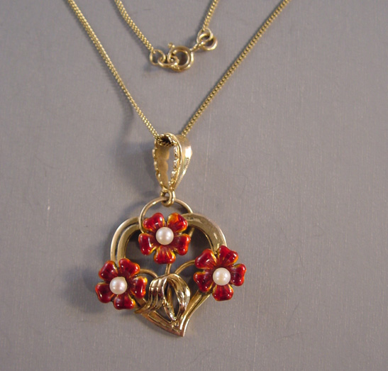 ENGLISH enameled pansy 9 carat yellow gold necklace with red enameled flowers with pearl centers set in a heart. This is hallmarked for Sheffield, 375 for 9 ct gold and I think the maker’s mark is, “S&R” or “S&B”. The date letter is for the 1920s I think, but it is very tiny and hard … Continue reading “ENGLISH S&B enameled pansy 9 carat yellow gold necklace red enameled”
