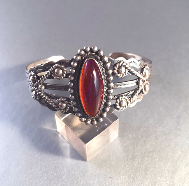 BAKELITE translucent black cherry juice red Zia sun carved bangle, 2-1/2″ by 1″ by 1/4″. The Zia sun is the symbol for the state of New Mexico! Circa 1940, this looks great with other bangles as well as alone. #B40308 $98.00