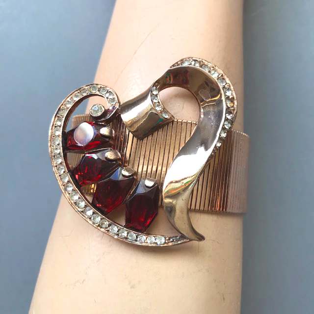 REJA attributed heart bracelet with ruby red and clear rhinestones on a smooth and easy to wear gold tone mesh band, 6-1/2″ wearable length and 1″ band. The heart center is about 2″ by 2″. As you can see in the photo, there is very slight wear to the gold tone finish on the back … Continue reading “REJA attributed heart bracelet with ruby red and clear rhinestones”