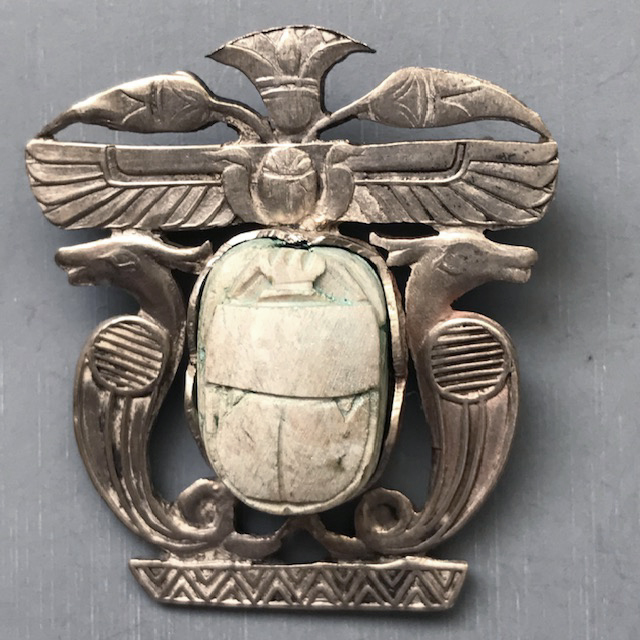EGYPTIAN revival very pale green faience scarab brooch set in in 800 silver metal, it has the lotus, animal or bird head and wings designs, 1-5/8″ by 1-1/2″. Faience is a kind of glazed ceramic or earthen ware. The lotus symbolizes rebirth. There are what seem to be Egyptian letters on the back of the … Continue reading “EGYPTIAN revival very pale green faience scarab brooch set in in 800 silver”