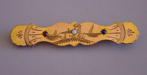 VICTORIAN bar pin with red and blue faceted stones and a white small cabochon, circa 1880s, 2 1/4″ wide. An etched scene of a light house and sailing ships adorns the front of this brooch. View. #V5154 $85.00