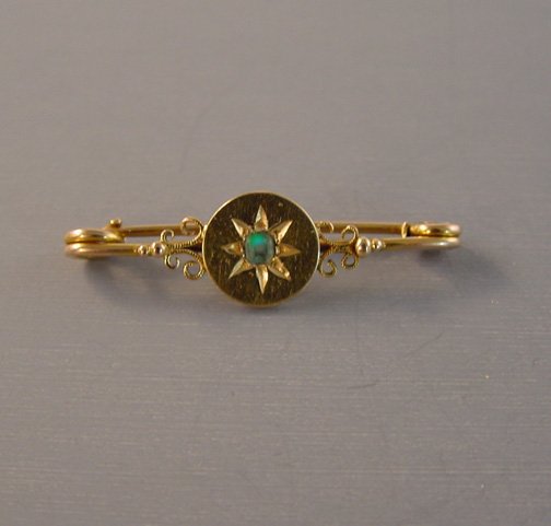 VICTORIAN 9 karat yellow gold bar pin with gypsy set greenish aqua rhinestone, marked 9ct on the hinge, 1-1/3″ wide. This is a lovely piece and it is in excellent condition. View #V37141 $110.00
