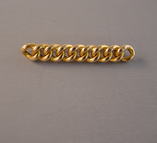 VICTORIAN 15 karat yellow gold bar pin with chain design, marked “15” under the back hinge, 1-3/4″ and weighs about .11 ounces. This is a fine jewelry piece and it is in excellent condition, ready to wear for years to come. View #V37143 $198.00